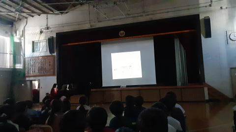会場の体育館に向かう途中、廊下でバッタリ会った小学2年生のお子さんたちが自分から進んで「こんにちは!」と、ひとりひとり声をかけてくれたことが印象的だった、とてもあたたかい雰囲気の学校でした。