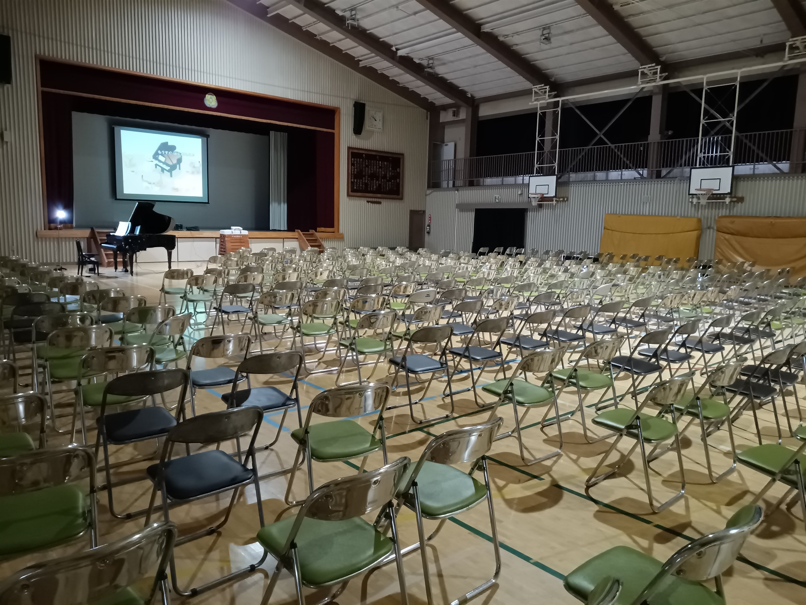 ご依頼をいただいた当初は、羽鳥小学校で実施する予定でしたが、ご担当の先生のお計らいと、小美玉市の四季文化館 みの~れさんのご協力によって、四季文化館 みの~れ 「風のホール」という場所で演奏させていただくことになりました。